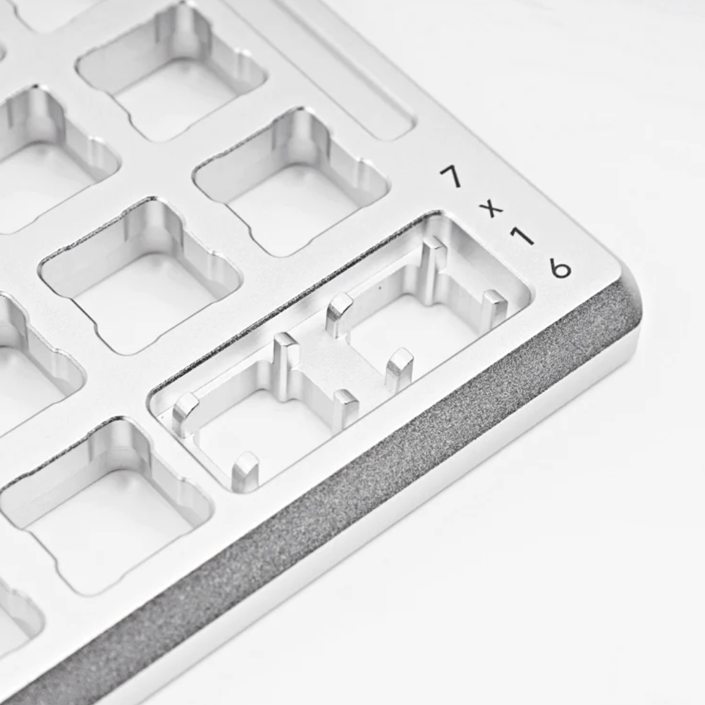La station de lubrification GEON est une station haut de gamme en acier inoxydable et aluminium, conçue pour une organisation optimale et dédiée à la lubrification et à la modification des interrupteurs mécaniques. Elle offre un espace suffisant pour plus de 100 interrupteurs, des outils d'ouverture intégrés pour les boîtiers MX et Kailh, ainsi qu'une surface stable et durable dotée d'une base antidérapante. Idéale pour les utilisateurs qui modifient régulièrement de nombreux interrupteurs ou qui souhaitent un processus de lubrification organisé.