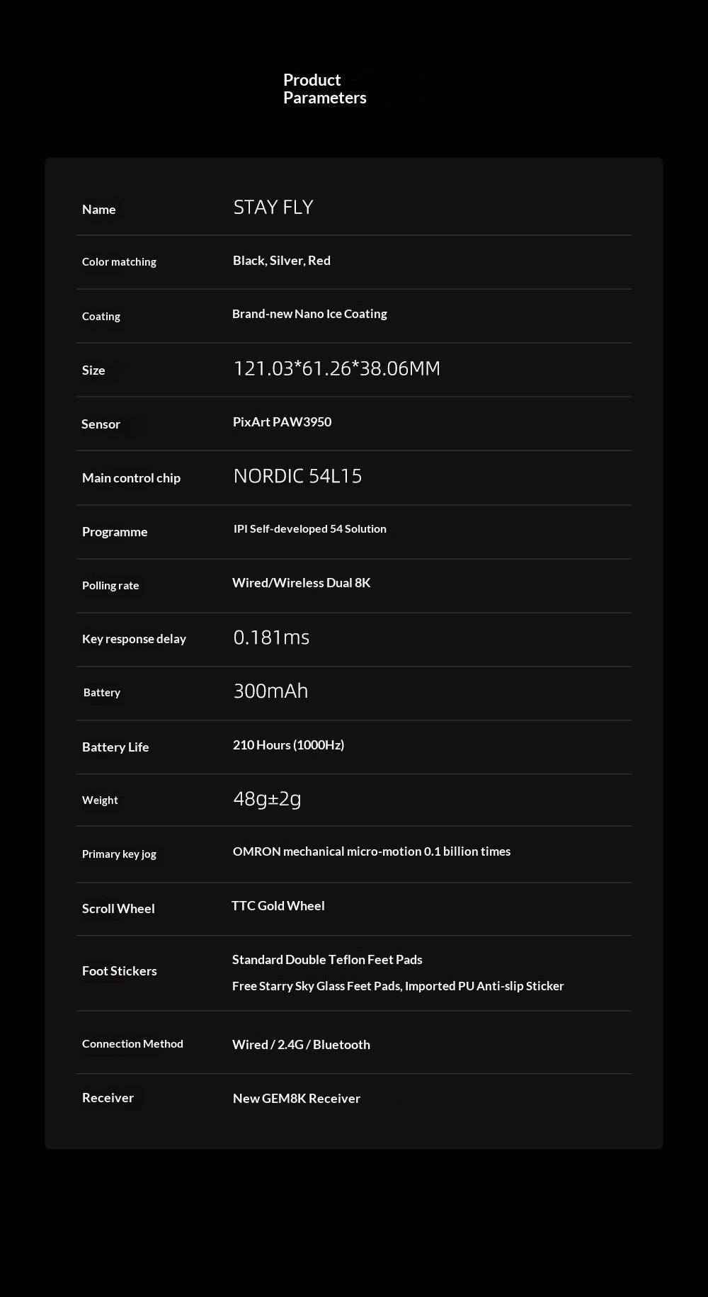 La souris gaming IPI Stay Fly est une souris ultra-légère conçue pour la performance, l'agilité et un design moderne. Son boîtier composite de haute qualité, renforcé de fibres de carbone, assure une stabilité exceptionnelle tout en conservant un poids plume et en offrant une prise en main technique et précise. Grâce à sa forme ergonomique et équilibrée, elle convient aussi bien aux jeux de tir rapides qu'aux longues sessions de jeu. La Stay Fly prend en charge trois modes de connexion, offrant une flexibilité maximale entre une utilisation filaire, une connexion sans fil 2,4 GHz à faible latence et la connectivité Bluetooth. L'accent est mis sur des temps de réponse rapides, une précision maîtrisée et un design épuré et fonctionnel, sans fioritures.
