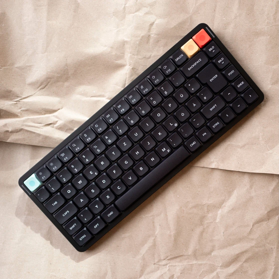 Disposition : ISO-DE (disposition allemande) au format environ 75 % (≈84 touches)